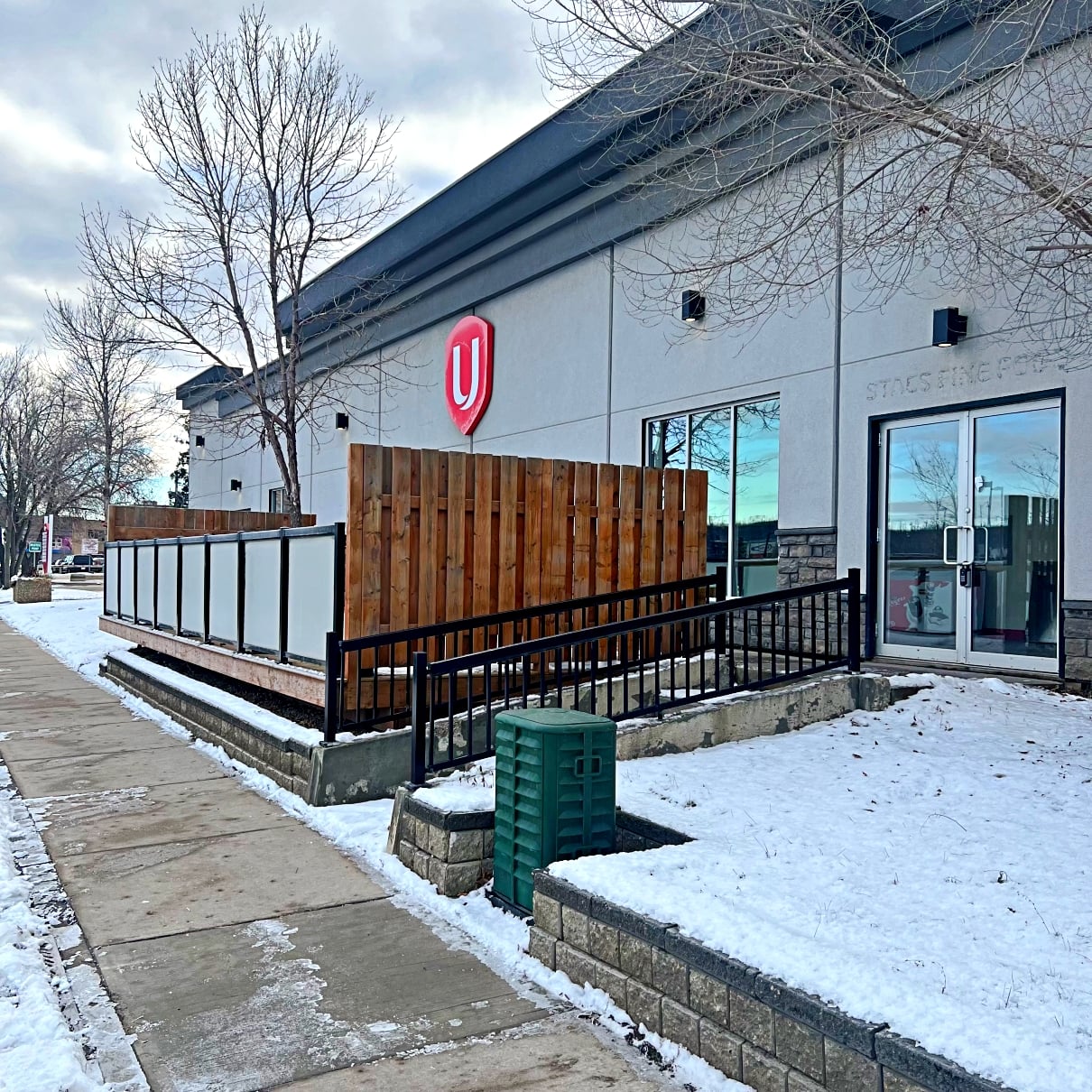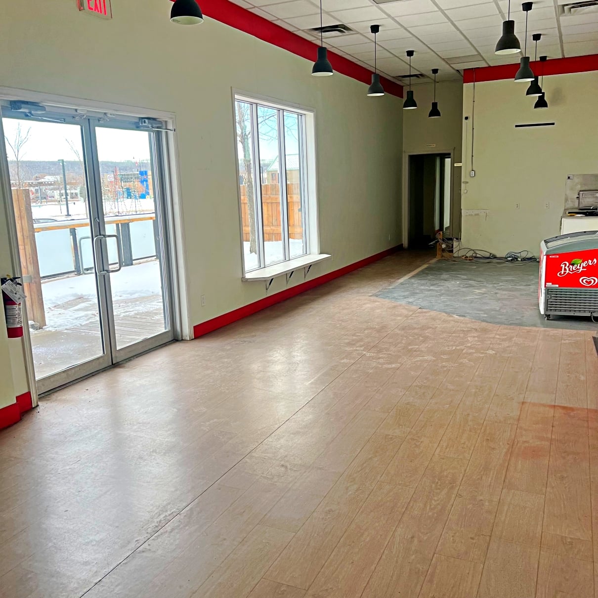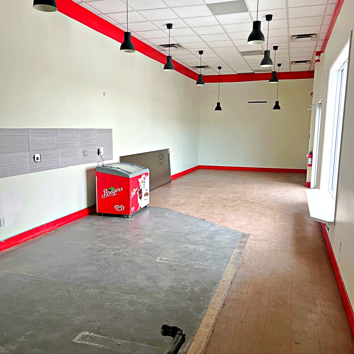 • Featuring two bathrooms, a storage room, additional water and sanitary connections, large storefront windows, and a custom-built front patio