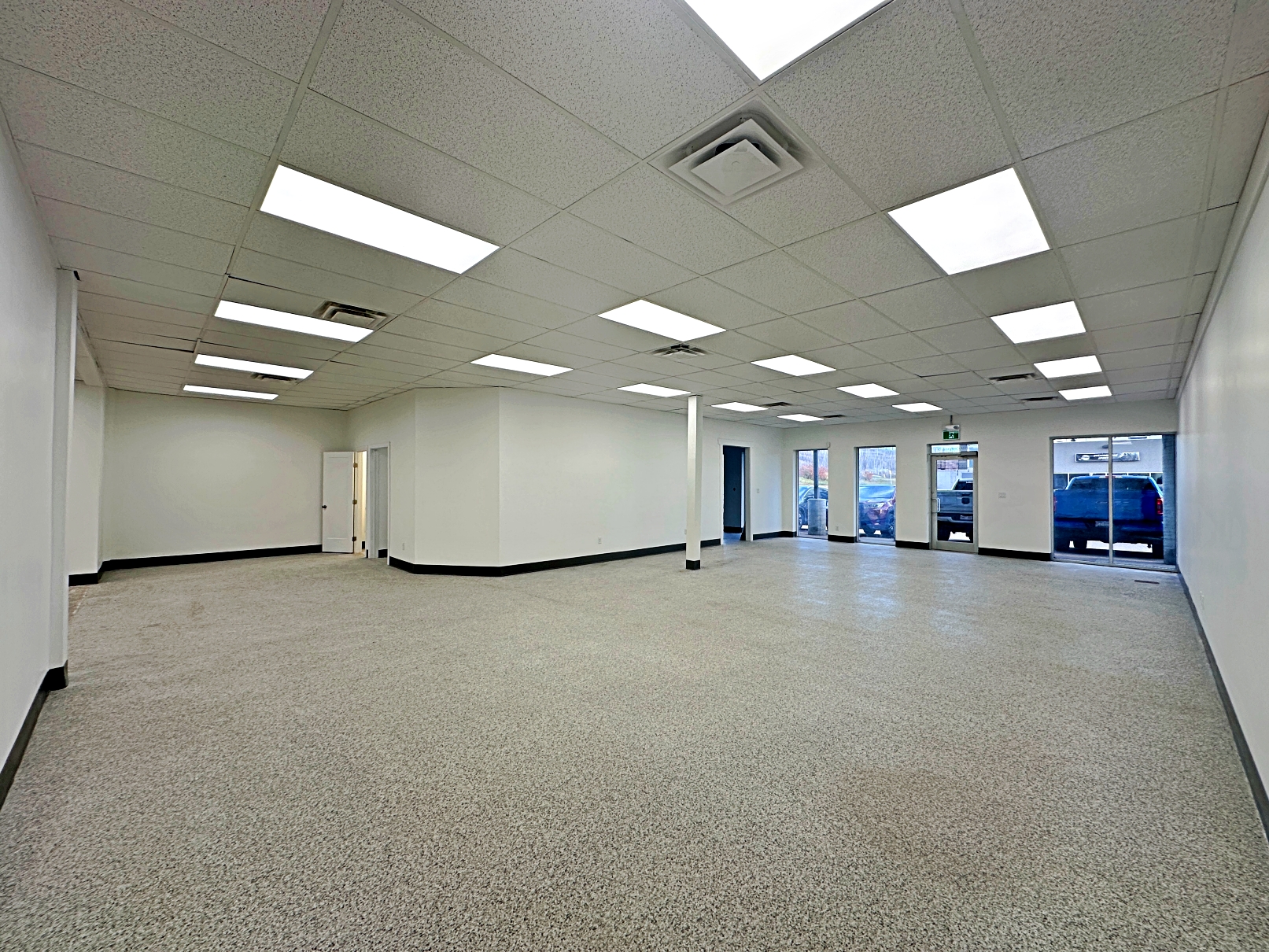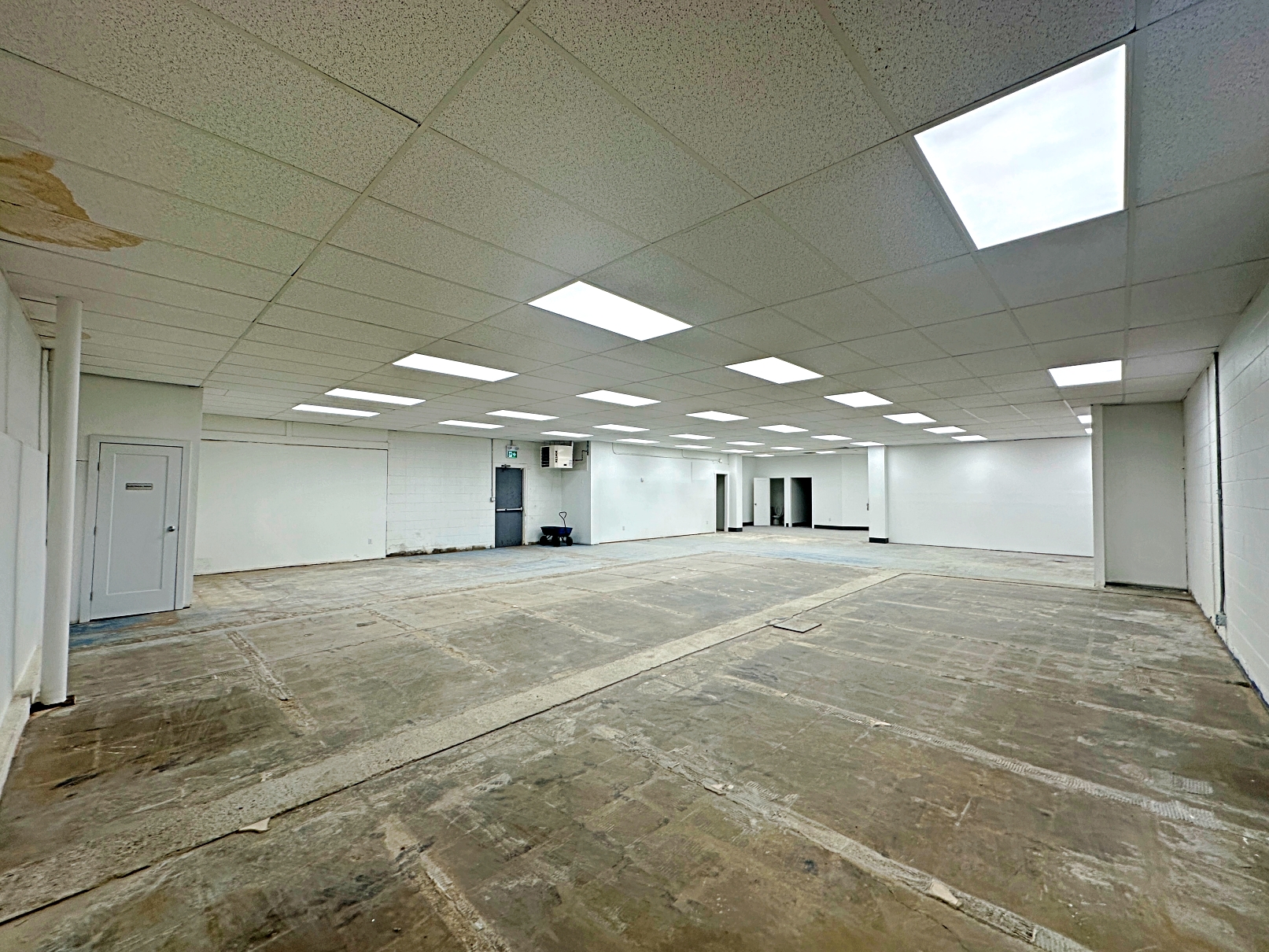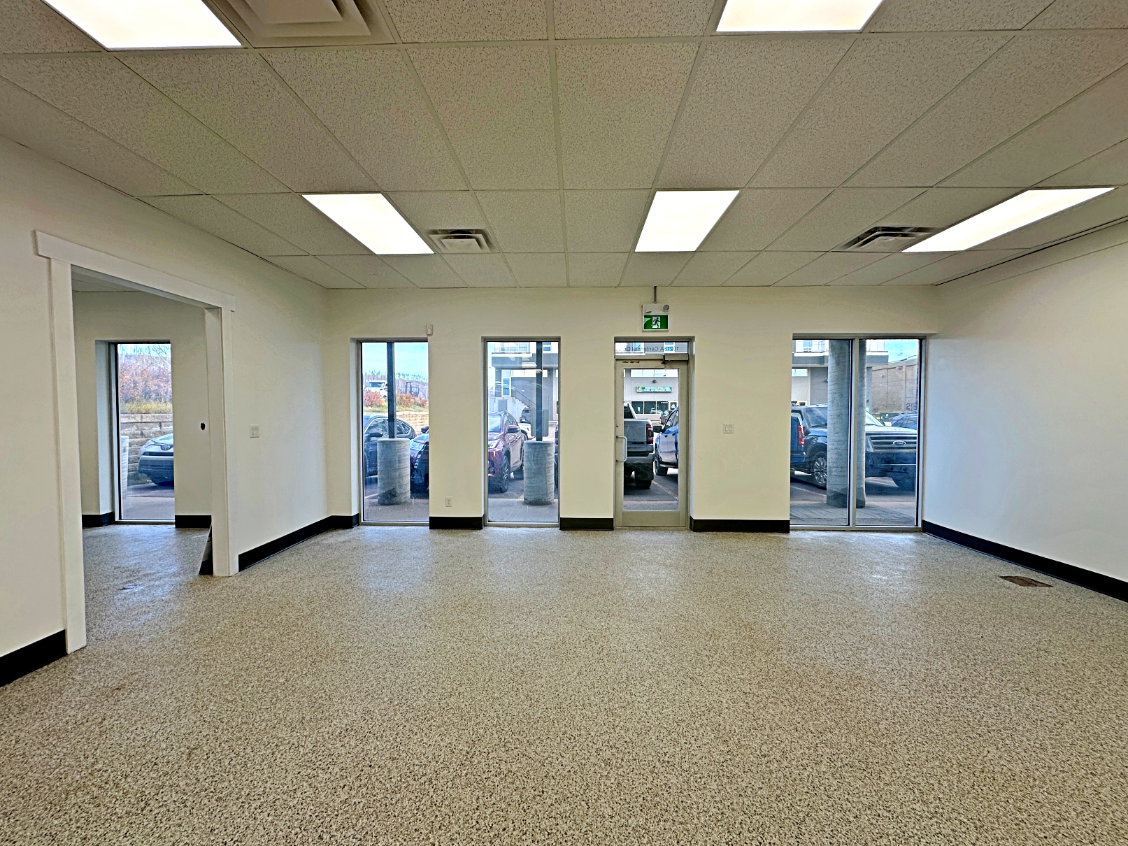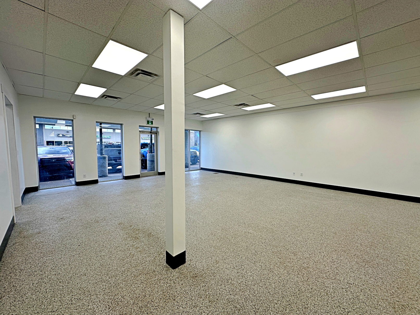 - Features large storefront display windows, a spacious front showroom, two washrooms, a staff room with roughed-in plumbing for a kitchenette, and a rear warehouse area with potential to add a rear double loading door for flexible access. Three dedicated parking stalls are available.